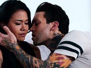 Busty curly brunette with big boobs fucks on couch