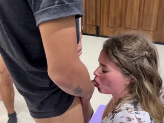 Chubby brunette sucks and gets her face splattered in cum