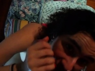 Chubby brunette smiles while working on a big dick in a POV video